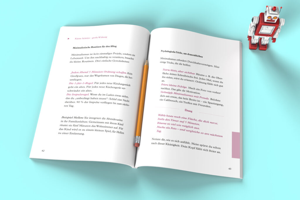 Der Ratgeber lässt Dich den Minimalismus leben; mit Achtsamkeit und lebensnaher Reflexion. Er geht über das reine Ausmisten hinaus und richtet den Blick auch auf innere Belastungen: Erwartungen, Routinen, Gedankenmuster und den ständigen Drang nach „mehr“. Im Buch sind zahlreiche Übungen, die du leicht in deinen Alltag einbauen kannst. Jule, Hellen und Paul sind drei Menschen, die dir mit ihren Problemen, Sorgen und Aha-Erlebnissen während des Lesens immer wieder begegnen.
